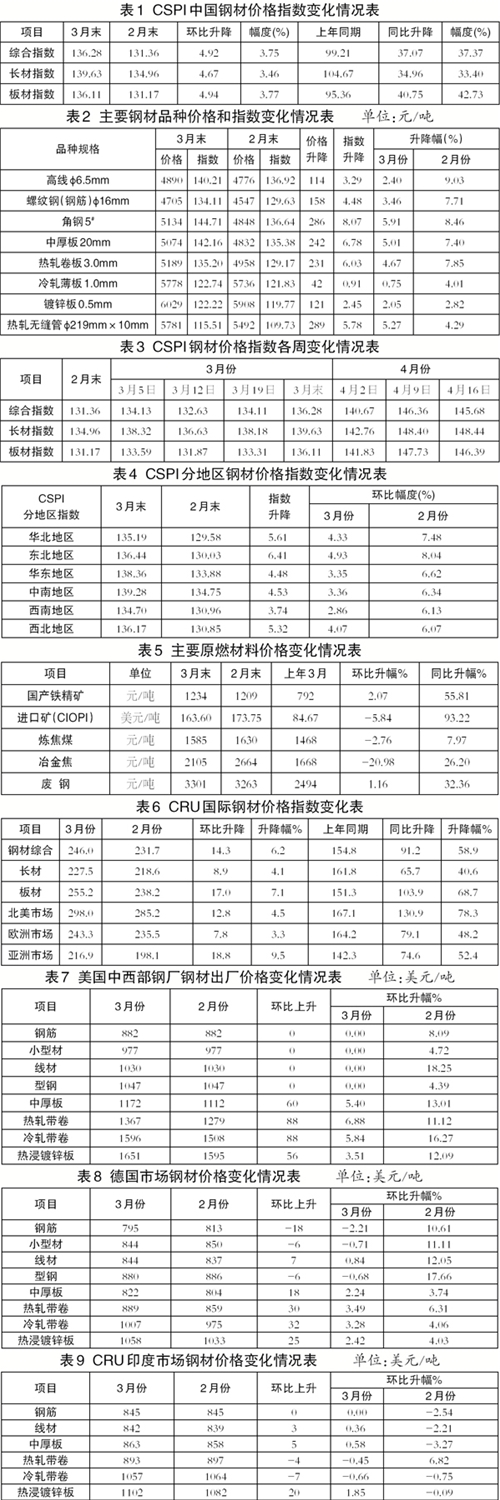 3月末,CSPI长材指数为139.63点,环比回升4.67点,升幅为3.46%;CSPI板材指数为136.11点,环比回升4.94点,升幅为3.77%,比长材升幅高0.31个百分点;与客岁同期比拟,长材指数回升34.96点,升幅为33.40%;板材指数回升40.75点,升幅为42.73%。(见图2、表1)